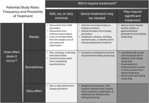 (An example risk summary table, envisioned as a way for a participant to have study risks contextualized by frequency and treatment.)
